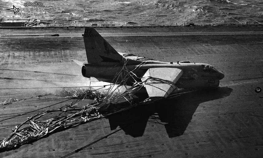 汤姆.多斯蒂(Tom Dostie)上尉的"Decoy 403"(BuNo 157478)在1991年1月24日撞上阻拦网后停下。这架飞机的前起落架轴于弹射过程中断裂,一个轮子丢失了,而第二个轮子几乎空悬着----可以从照片右侧看到它在甲板弹起。四十八小时后,这架海盗II被拆除了任何可以用来让其它A-7飞机继续飞行的宝贵部件,以军事荣誉被推进了海里。