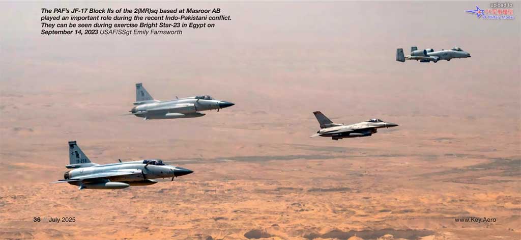 巴基斯坦空军驻扎在马斯鲁尔空军基地的第2中队的JF-17 Blk2在最近的印巴冲突中发挥了重要作用。照片摄于2023年9月14日在埃及举行的亮星-23演习中。