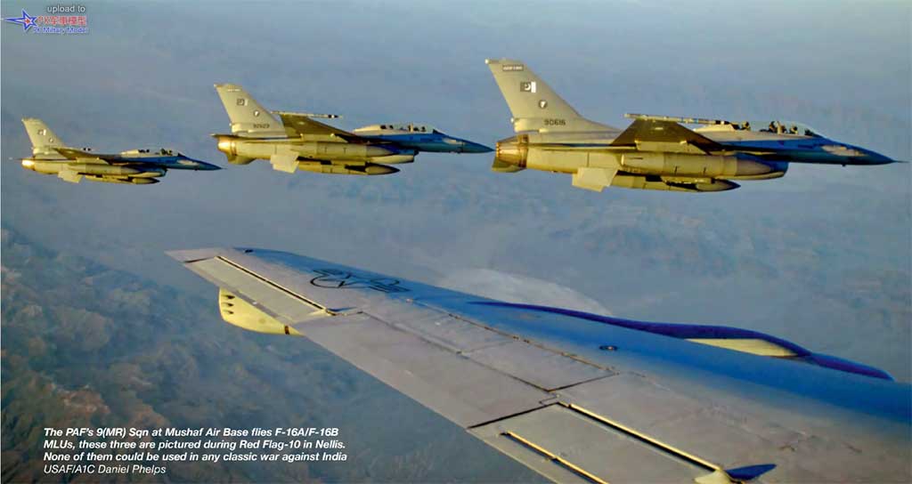 巴基斯坦空军驻穆沙夫空军基地第9中队装备了F-16A/F-16B多用途战斗机,这三架战机是在内利斯空军基地举行的红旗-10演习中拍摄的。这些美制战机都无法用于任何针对印度的常规战争。