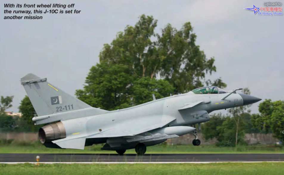 随着前轮离开跑道,这架歼-10C准备执行另一次任务。