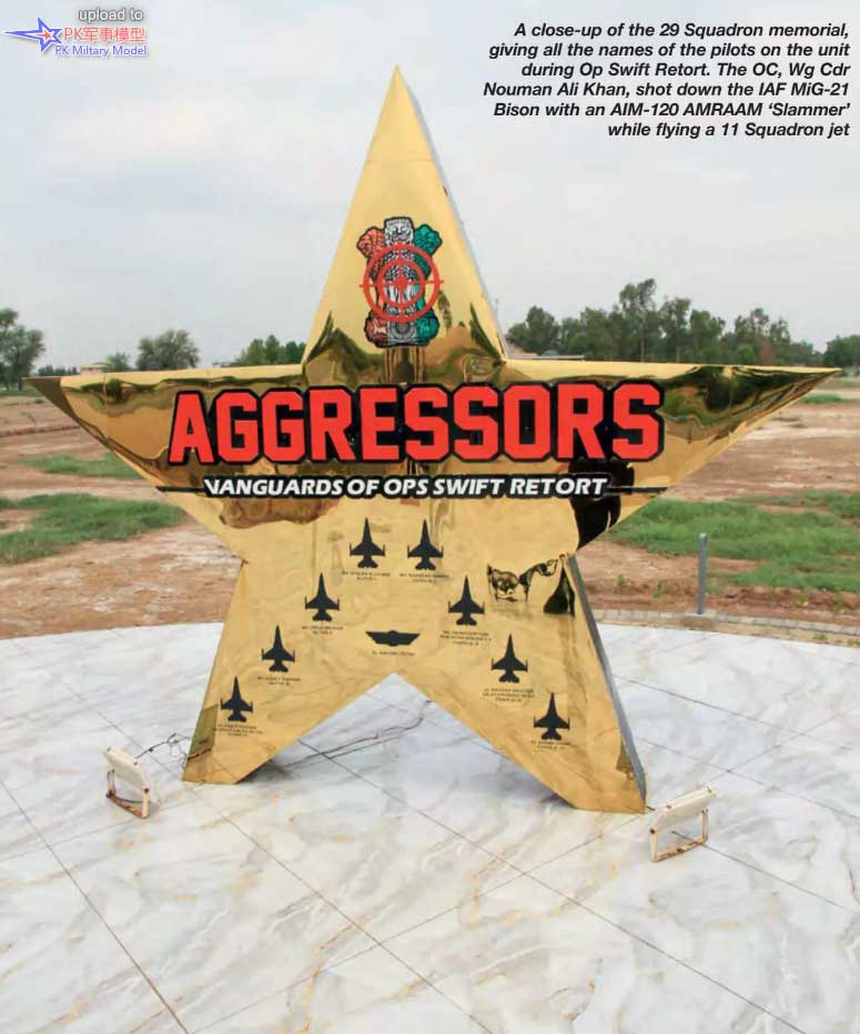 第29中队纪念碑的特写镜头,上面列出了快速反击行动期间该部队所有飞行员的名字。指挥官诺曼.阿里.汗(Nouman Ali Khan)中校驾驶一架第11中队的喷气机,用AlM-120 AMRAAM击落了一架印度空军的米格-21野牛。