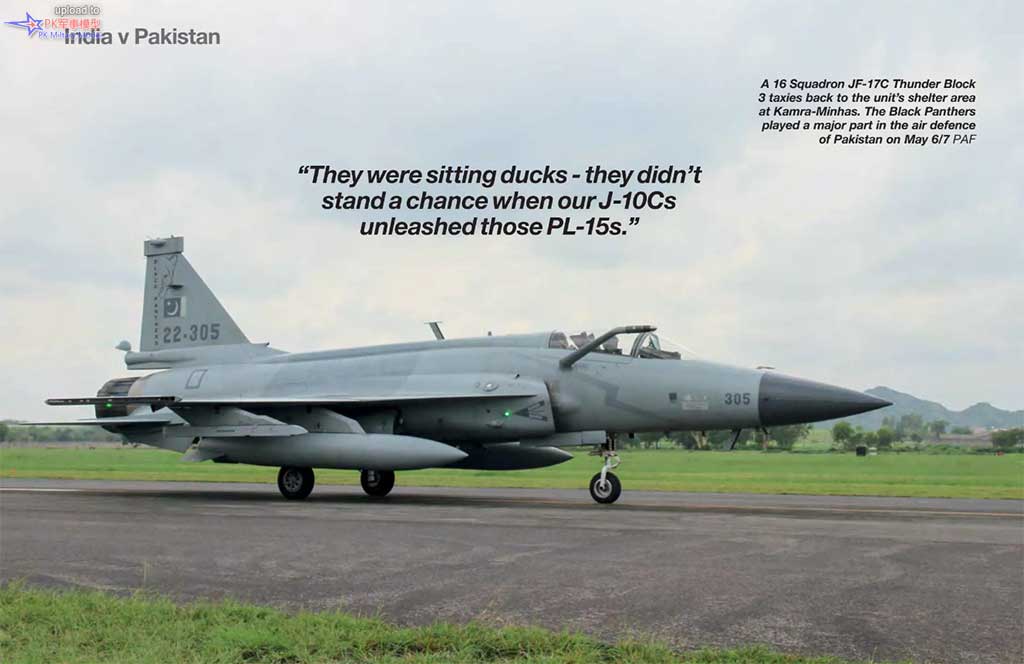 第16中队的一架JF-17C Blk3滑行返回位于卡姆拉-米纳斯的中队掩体区域。“黑豹”中队在5月6日至7日的巴基斯坦防空行动中发挥了重要作用。