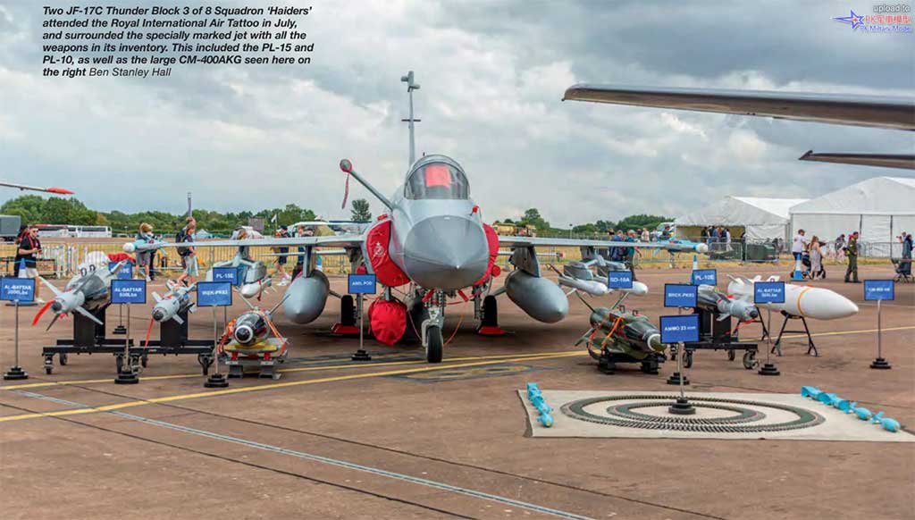 7月,来自第8“海德尔”中队的两架JF-17C Blk 3参加了英国皇家国际航空纹身展,并在这架特别标记的战机周围展示了其所有武器。其中包括霹雳-15和霹雳-10,以及图中右侧所示的大型CM-400AKG。