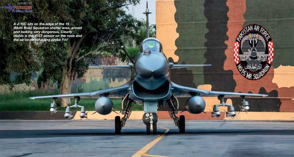 一架歼-10C停在第15(多用途)中队掩体区域的边缘,全副武装,看起来非常危险,机鼻上的ISRT传感器和空中受油管清晰可见。