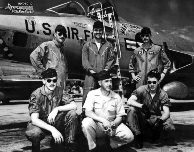 45TRS中队给他们的一些飞机起了名字,而这种行为在1969年则变得更加流行。RF-101C-65-MC 56-0079“MARY ANN BURNS(灵感来源于一首献给一位享有盛誉的女士的颂歌)”被指派给弗雷德.穆赛格斯(Fred Muesegaes)中尉(前排左一),照片摄于1960年大理石能力行动首次被派往曼谷廊曼机场期间。照片中的其它人分别是肯.哈布斯特(Ken Habst)少校(前排中间)、杰克.韦瑟比(Jack Weatherby)中尉(前排右一)、拉尔夫.德.卢西亚(Ralph de Lucia)上尉(后排左一)、比尔.惠滕(Bill Whitten)上尉(后排中间)、约翰.利尼汉(John Linihan)中尉(后排右一)。当中队五颜六色的标志被迷彩漆覆盖时,飞行员们戴上圆点围巾和头盔,或在一些飞机的尾翼帽上涂上简化版,将它们保存到一定程度。
