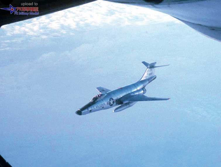 1964年,从加油机上观察一架全金属涂装的RF-101C,它正前往老挝执行一次任务。RF-101C在东南亚的成果与其数量不成比例,1966年12月最高峰时的总数也只有29架,分别部署在新山一和廊曼。至1968年1月,飞机的数量下降至17架,仅驻扎于新山一,其一线服役生涯将近14年。